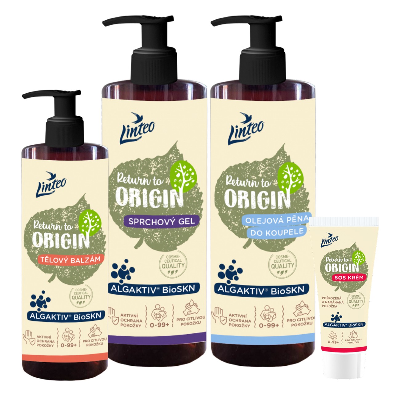 Balíček produktů Linteo, Return to ORIGIN - Obsahuje SOS krém 25ml, olejovou pěnu do koupele 385ml, sprchový gel 385ml a tělový balzám 385ml.