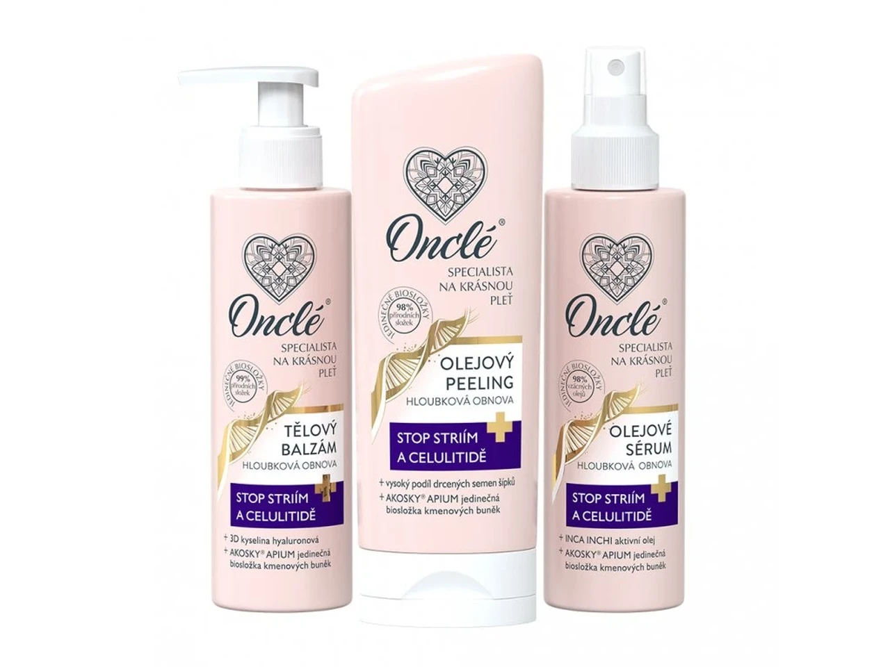 Dámská prémiová sada Onclé - obsahuje jemný tělový balzám, olejové sérum a zpevňující olejový peeling