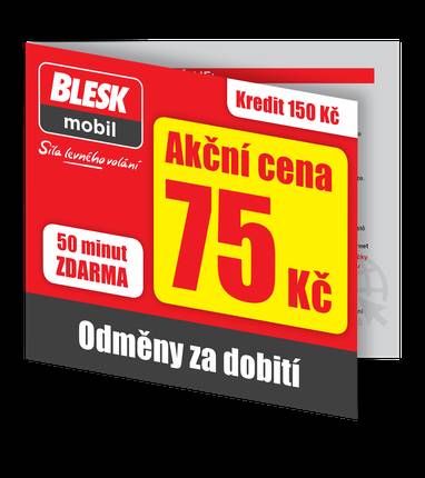 SIM karta BLESKmobil obsahuje 150 Kč počáteční kredit a Balíček 50 MINUT (50 minut volání do všech sítí v ČR) na prvních 30 dní zdarma. Balíček se po 30 dnech automaticky obnoví za 50 Kč na dalších 30 dní. S tímto balíčkem výrazně ušetříte, protože minuta hovoru Vás vyjde pouze na 1 Kč/min., oproti standardní sazbě bez balíčku, která činí 2,50 Kč/min. SIM kartu můžete dobíjet na řadě dobíjecích míst jako jsou trafiky, Sazka terminály, pošty, bankomaty ČSOB, online bankovnictví nebo kartou prostřednictvím internetové Samoobsluhy. A navíc můžete čerpat odměny při každém dobití nad 300 Kč. Navštivte web www.bleskmobil.cz a aktivujte si spoustu dalších výhod.