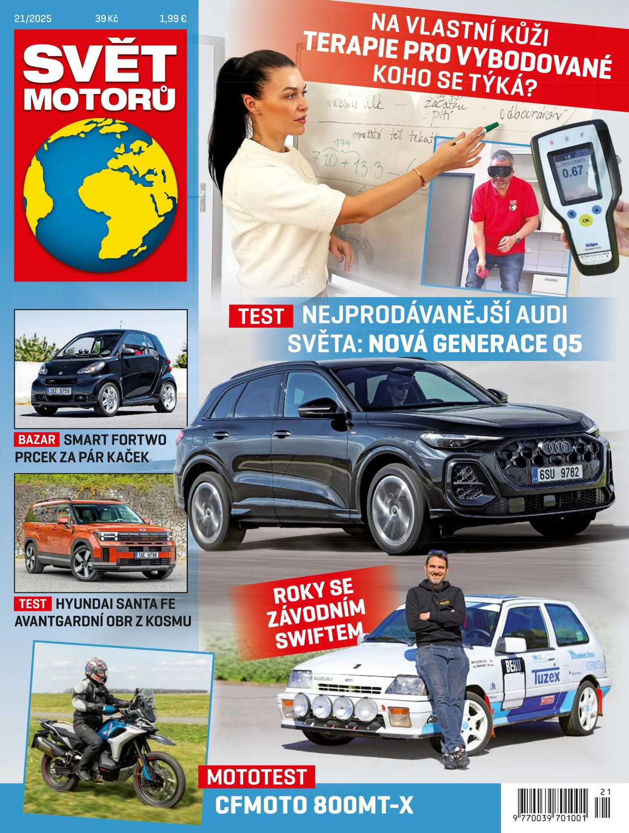 Světový rekord Světa motorů. Na střeše auta na lyžích rychlostí 208,22km/h. Finále ročního testu. Škoda Enyan. Známe její největší slabinu. Bazar: Saab 9-5 první generace. Reportáž v Číně za motocykly.