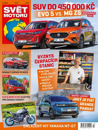 Srovnávací test: SUV do 450.000 Kč. EVO 5 vs. MG ZS. Byznys čerpacích stanic. Návrat legendy. Jaký je Fiat Grande Panda? Omlazený hit Yamaha MT-07. Dlouhodobý test: Renault Espace po roce. Bazar: Ojeté BMW i3 Rex.
