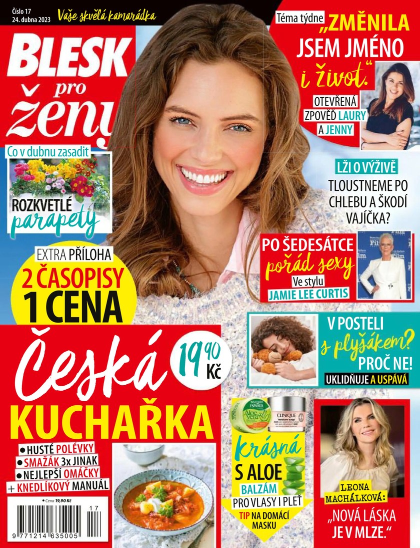 Příloha: Česká kuchařka. Husté polévky, smažák 3x jinak, nejlepší omáčky + knedlíkový manuál. Téma týdne - otevřená zpověď Laury a Jenny: „Změnila jsem jméno i život.“ Lži o výživě: Tloustneme po chlebu a škodí vajíčka? Ve stylu Jamie Lee Curtis: Po šedesátce pořád sexy. V posteli s plyšákem? Proč ne! Uklidňuje a uspává. Leona Machálková: „Nová láska je v mlze.“ Krásná s aloe: Balzám pro vlasy i pleť, tip na domácí masku. Co v dubnu zasadit: Rozkvetlé parapety.
