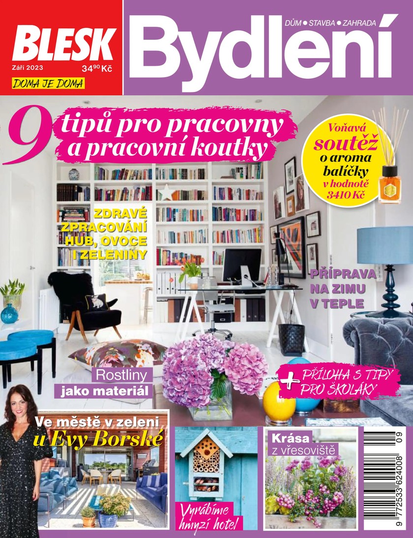 9 tipů pro pracovny a pracovní koutky. Zdravé zpracování hub, ovoce a zeleniny. Příprava na zimu v teple. Rostliny jako materiál. Příloha s tipy pro školáky. Ve městě v zeleni u Evy Borské. Vyrábíme hmyzí hotel. Krása z vřesoviště.