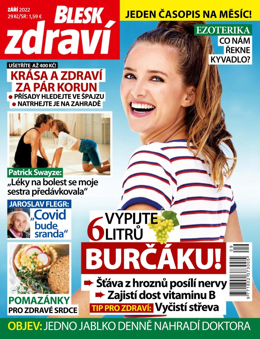 Vypijte 6 litrů burčáku. Šťáva z hroznů posílí nervy. Zajistí dost vitaminu B. Vyčistí střeva. Krása a Zdraví za pár korun. Přísady hledej ve špajzu, natrhejte je na zahradě. Patrick Swayze ,, Léky na bolest se moje sestra předávkovala". Jaroslav Flegr ,,Covid bude sranda". Pomazánky pro zdravé srdce. Ezoterika, co nám řekne kyvadlo? Objev: jedno jablko denně nahradí doktora.Podrobnosti